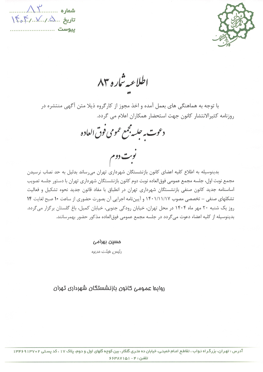بدینوسیله به اطلاع کلیه اعضای کانون بازنشستگان شهرداری تهران می رساند بدلیل به حد نصاب نرسیدن مجمع نوبت اول، جلسه مجمع عمومی فوق العاده نوبت دوم کانون بازنشستگان شهرداری تهران با دستور جلسه تصویب اساسنامه جدید کانون صنفی بازنشستگان شهرداری تهران در انطباق با مفاد قانون جدید نحوه تشکیل و فعالیت تشکلهای صنفی – تخصصی مصوب ۱۴۰۱/۱۱/۱۷ و آیین نامه اجرایی آن بصورت حضوری از ساعت ۱۰ صبح لغایت ۱۴ روز یک شنبه ۲۰ مهر ماه ۱۴۰۴ در محل تهران، خیابان رودکی جنوبی، خیابان کمیل، باغ گلستان برگزار می گردد. بدینوسیله از کلیه اعضاء دعوت می گردد در جلسه مجمع عمومی فوق العاده مذکور حضور بهمرسانند.